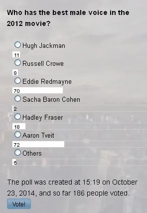 Aaron Tveit (Enjolras) turned out to be the favorite actor from the 2012 film of majority of the voters, closely followed by Samantha Barks (Éponine). Next was Anne Hathaway (Fantine), Russell Crowe (Javert) and Hugh Jackman (Jean Valjean), tied up with Amanda Seyfried (Cosette). Eddie Redmayne (Marius Pontmercy), Sacha Baron Cohen (Thénardier) and Helena Bonham Carter (Madame Thénardier) got the least number of votes.