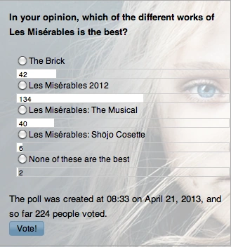 Majority of the voters chose the 2012 film as their favorite adaptation of Les Misérables while some prefer The Brick and the Musical adaptation. Les Misérables:Shojō Cosette appeared to be the least favourite, although some thought that none of the choices are the best.