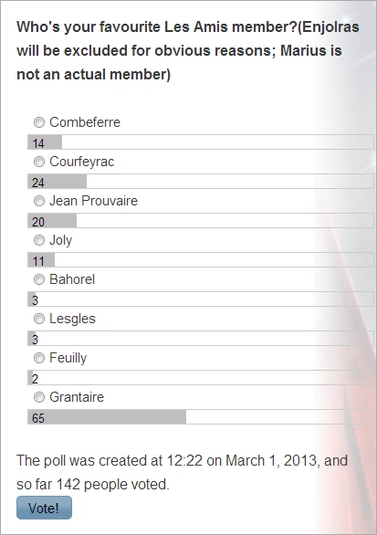 Note: Enjolras was excluded from the poll because he already won as the most favourite character alongside Éponine. Marius was also excluded because originally he was not a member until the uprising in the Brick.