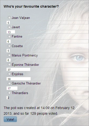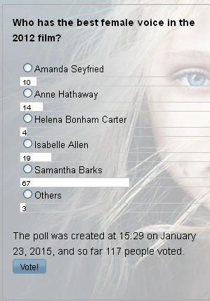 Users' favourite female voice by no doubt was Samantha Barks' (Eponine). She won with 67 votes out of total 117 (57%). Next was Isabelle Allen, who played a role of Little Cosette and received 19 points. Then was Anne Hathaway (Fantine) followed by Amanda Seyfried, who received respectively 14 and 10 votes. Anyway, Helena Bonham Carter (Madame Thenardier) became the least favourite.
