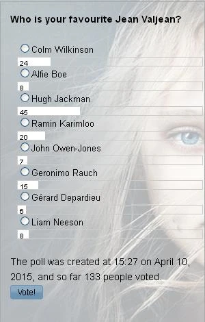Out of 133 people 45 voted for Hugh Jackman (2012 film) as the best actor to play Jean Valjean. Users' second favourite became Colm Wilkinson, who was the original London and Broadway Valjean and also played in 10th anniversary concert. Ramin Karimloo, however, received only 4 votes less than Wilkinson.
