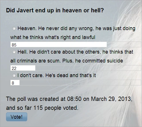 It seems that majority of the fans believe that Javert ended up in heaven while a few believes that he ended up in hell. Others, on the other hand, didn't even bother to care where he ended up and was just contented that Javert died.