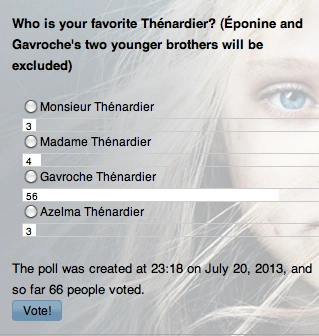 Gavroche turned out to be the most well-liked Thénardier in Les Misérables.Thénardier got the least number of votes tied up with Azelma. The people who contributed to the poll were very few, as this was the poll that got the least contributors.