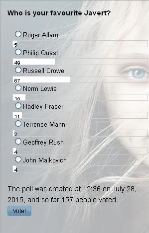 Users' favourite Javert became Russell Crowe, who played the role in the 2012 film. He was closely followed by the Philip Quast (10th anniversary concert). These two actors heavily outdistanced the others, however honorable mentions can be made for Norm Lewis (25th anniversary concert) and Hadley Fraser (West End).