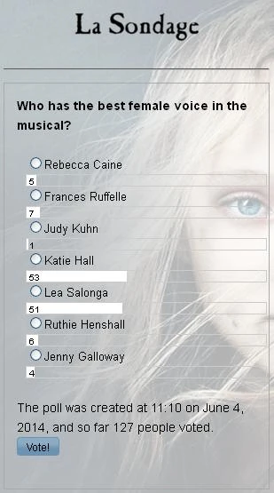 Users' favourite female voice from the musical became Katie Hall's (Cosette in 25th anniversary concert). Katie won by 2 votes with Lea Salonga (Eponine in 10th anniversary concert and Fantine in 25th). Third place belongs to Frances Ruffelle (Eponine in Original London and Broadway Cast). Ruthie Henshall (10th anniversary Fantine),Rebecca Caine (Original London Cosette), Jenny Galloway (Madame Thenardier) and Judy Kuhn (Cosette) became the least favourite ones.