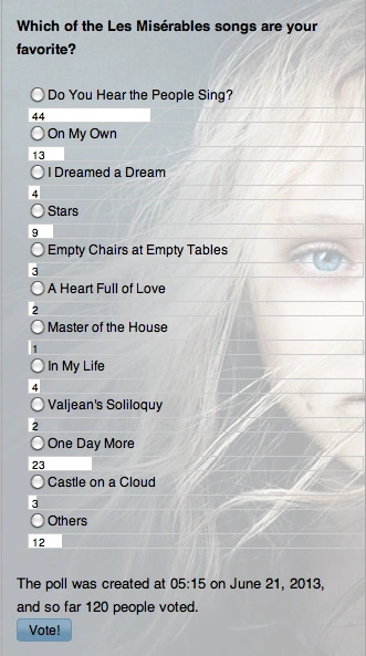 Do You Hear the People Sing? appeared to be the song which got the most votes with One Day More and On My Own following. Although it's safe to say that the three are the most beloved songs in Les Misérables, some voters also chose Stars, I Dreamed a Dream, In My Life and Castle on a Cloud tied up with Empty Chairs at Empty Tables, as well as songs that were not on the list which came in fourth place. A Heart Full of Love, Valjean's Soliloquy and Master of the House got the least number of votes.