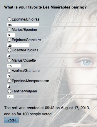 According to the poll, the most well-liked Les Misérables pairing (commonly known as ship or shipping) is the Enjolras/Éponine pairing, or as most people call it, Enjonine. Second, came in E/R, Enjolras and Grantaire's homosexual pairing. Third came in Marius/Cosette (Mariette), then Marius and Éponine (Méponine) and Fantine/Valjean (Faljean). Cosette/Enjolras (Enjosette), Azelma/Grantaire (Grantzelma), and Éponine/Montparnasse (Épparnasse) came in last.